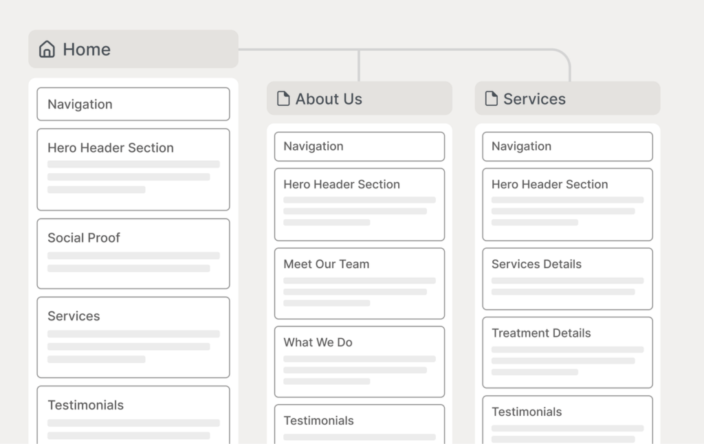 We schetsen alle pagina’s en secties van de website om een duidelijk beeld te krijgen.